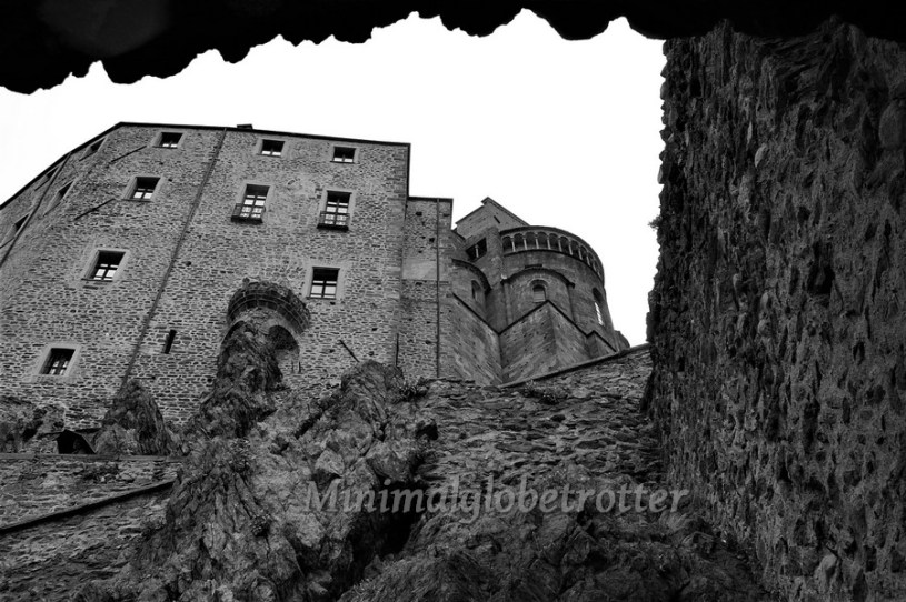 Mentre il giorno precedente era una caldissima giornata di sole, con medie molto più alte di quelle stagionali, il giorno della visita alla Sacra il tempo aveva voltato faccia e la Val di Susa ci ha accolto in una plumbea giornata di pioggia, che a dire il vero non ha tolto fascino all’abbazia anche se ha limitato la visuale sull’immenso paesaggio che si apre sotto. Ma quando ci hanno detto che questo luogo è situato in un punto climaticamente non facile e la sua naturale condizione è quella di essere al centro di correnti d’aria che si scontrano generando tremendi fulmini e tempeste, tanto che per preservarla sono stati tirati chilometri di fili di alluminio, e di venti che anche in estate seccano tanto l’aria da favorire gli incendi nei boschi intorno, allora mi sono quasi convinta che quella era la giornata giusta per vedere questa meraviglia in pietra edificata sulla roccia.