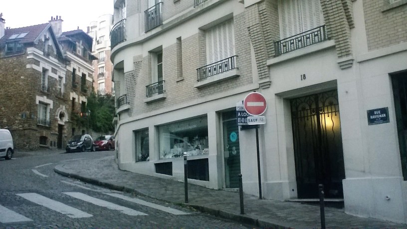 In alcuni punti la strada si spezza, viene interrotta da altre strade, e poi riprende poco più in su con lo stesso nome. A tutti i cartelli con la scritta Rue Ravignan mia figlia vuole una foto, in verticale, in orizzontale, con l’albero accanto, con la finestrella.