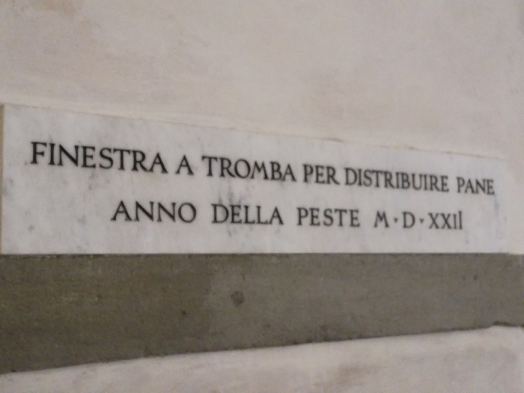 Ultima particolarità; una finestra a tromba, oggi murata, che serviva per distribuire pane nell’anno della peste MDXXII. Era il 1522 ed era quella stessa peste bubbonica descritta dal Manzoni nei Promessi Sposi. I Buonomini dall’interno facevano rotolare il pane fin nelle mani degli appestati senza rischi di contagio.